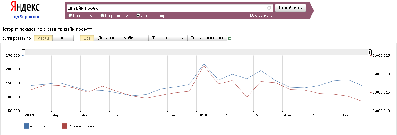 Если проследить динамику по запросу «дизайн-проект» в поисковой системе за последние два года (январь 2019 - декабрь 2020), то из графика видно, что: