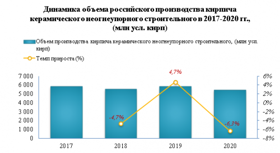 В 2020 года объем отгрузок кирпича керамического неогнеупорного строительного в России составил 4 216,2 млн усл. кирп, что на 3,1% больше, чем в предыдущем году.