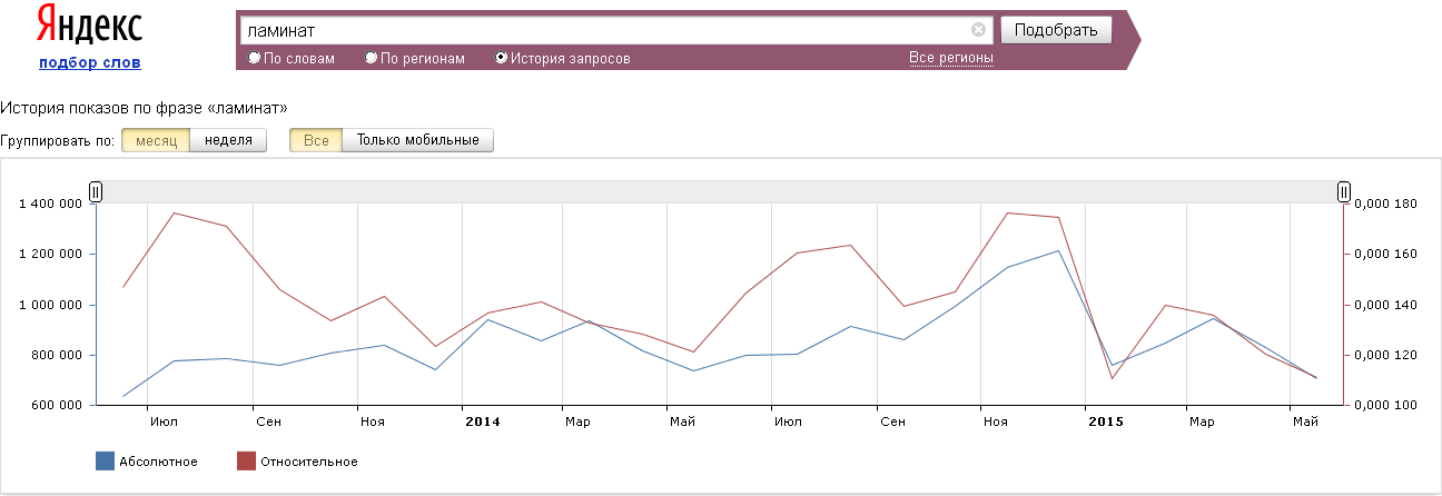 Если проследить динамику по запросу «ламинат» в поисковой системе за последние два года (июнь 2013-май 2015),