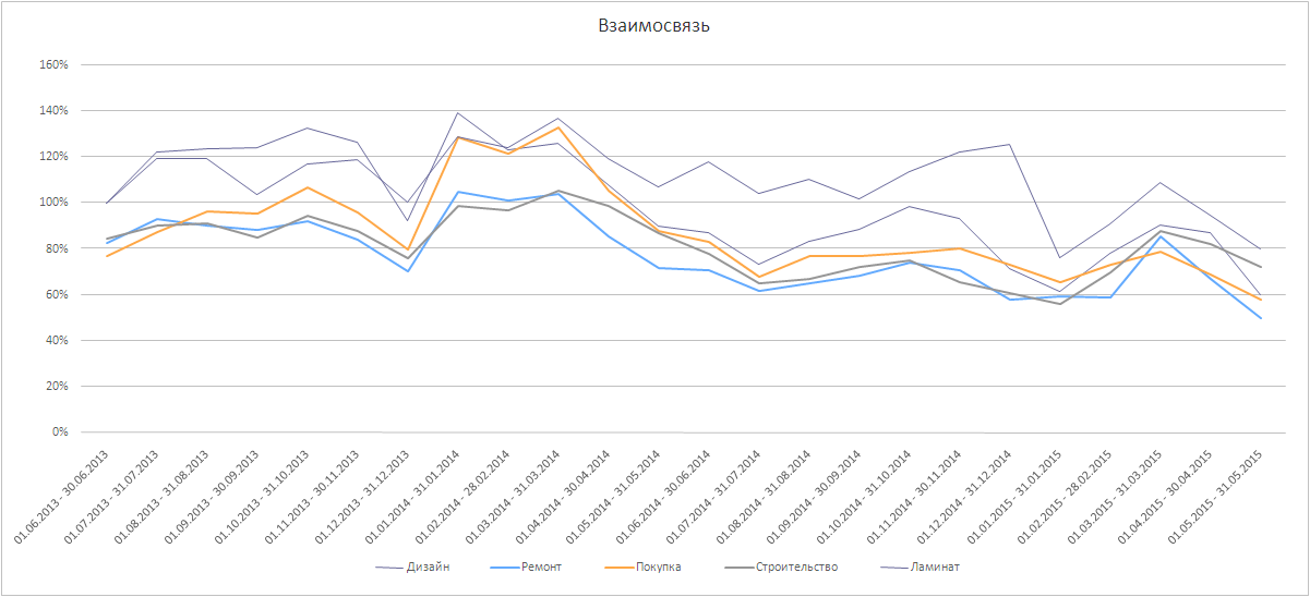 На графике ниже видна динамика запросов «стройматериалы», «дизайн интерьера», «ремонт квартир», «купить квартиру», «строительство», «ламинат» с учетом региона (Москва) за два года (июнь 2013-май 2015) и их взаимосвязь.